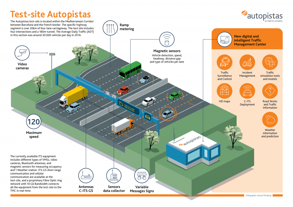 The Spanish test site is located within the Mediterranean Corridor between Barcelona and the French border. The specific highway segment is over 20km of four-lane carriageway. Each lane is 3,5m wide. The internal hard shoulder is 1m and the external hard shoulder is 2,5m. The highway median is 5m wide (in average). The test site includes four intersections and a 180m tunnel. The Average Daily Traffic (ADT) in this section was around 30.000 vehicles per day in 2016, and the speed limit is 120km/h.